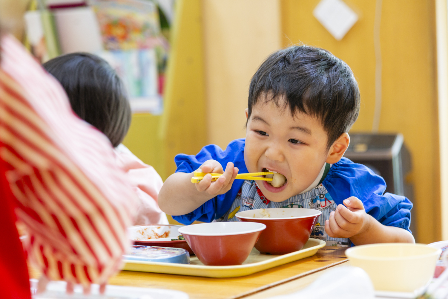 給食をほおばる園児。苦手なものを食べるときは、”頑張る心”と”我慢する心”が必要