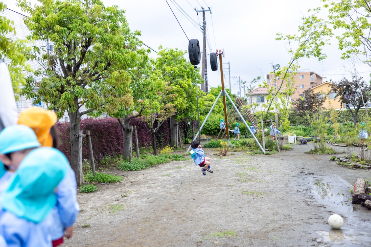 順番を待ちながら先発するお友達を⾒守ったり、年⻑児が年少児を助けたりする姿も⽇常のひとコマだ。ルールを教えるのではなく、遊びの中で⾃然と気づいていく。この園庭には、そんな成⻑の種が静かに埋め込まれている。