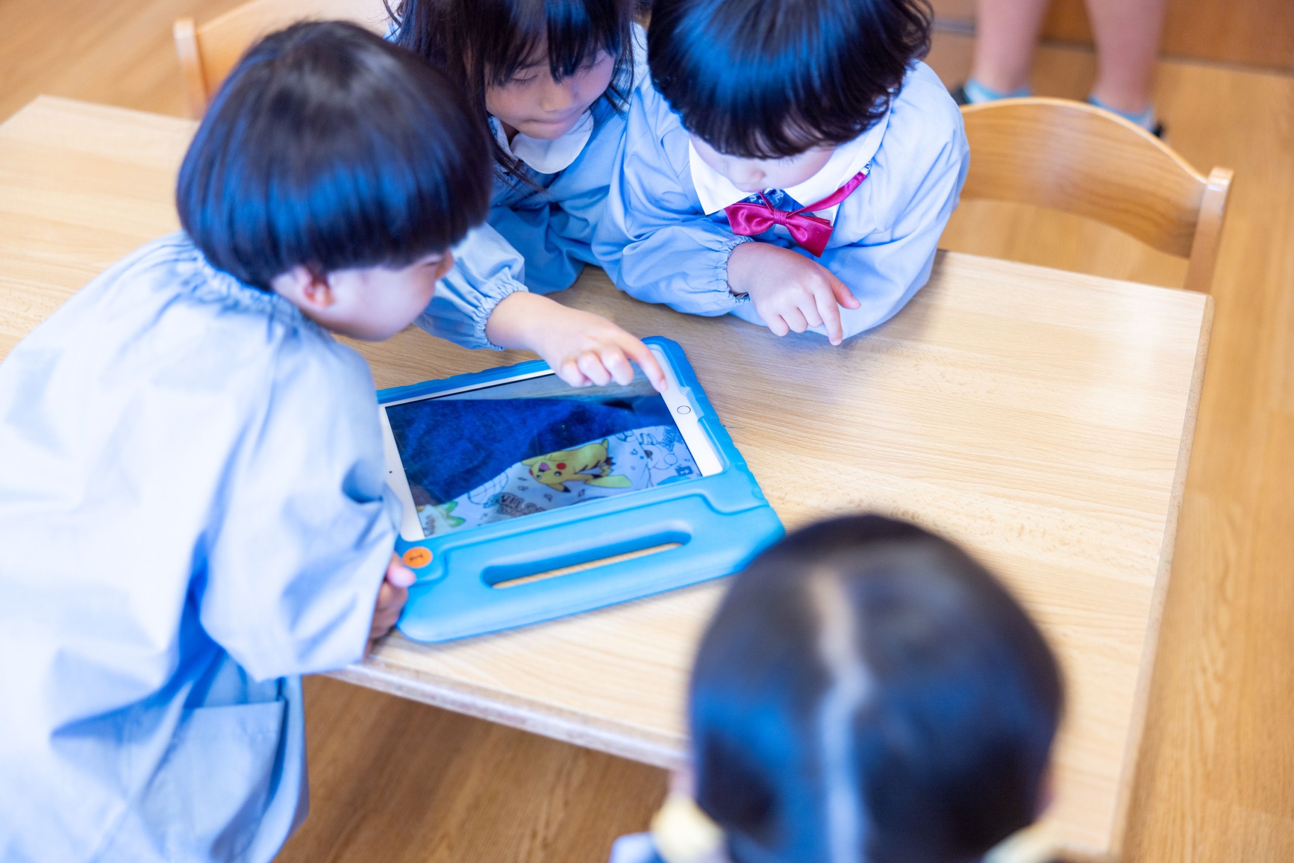 ICTツールを使い新たな発見を伝え合う園児たち