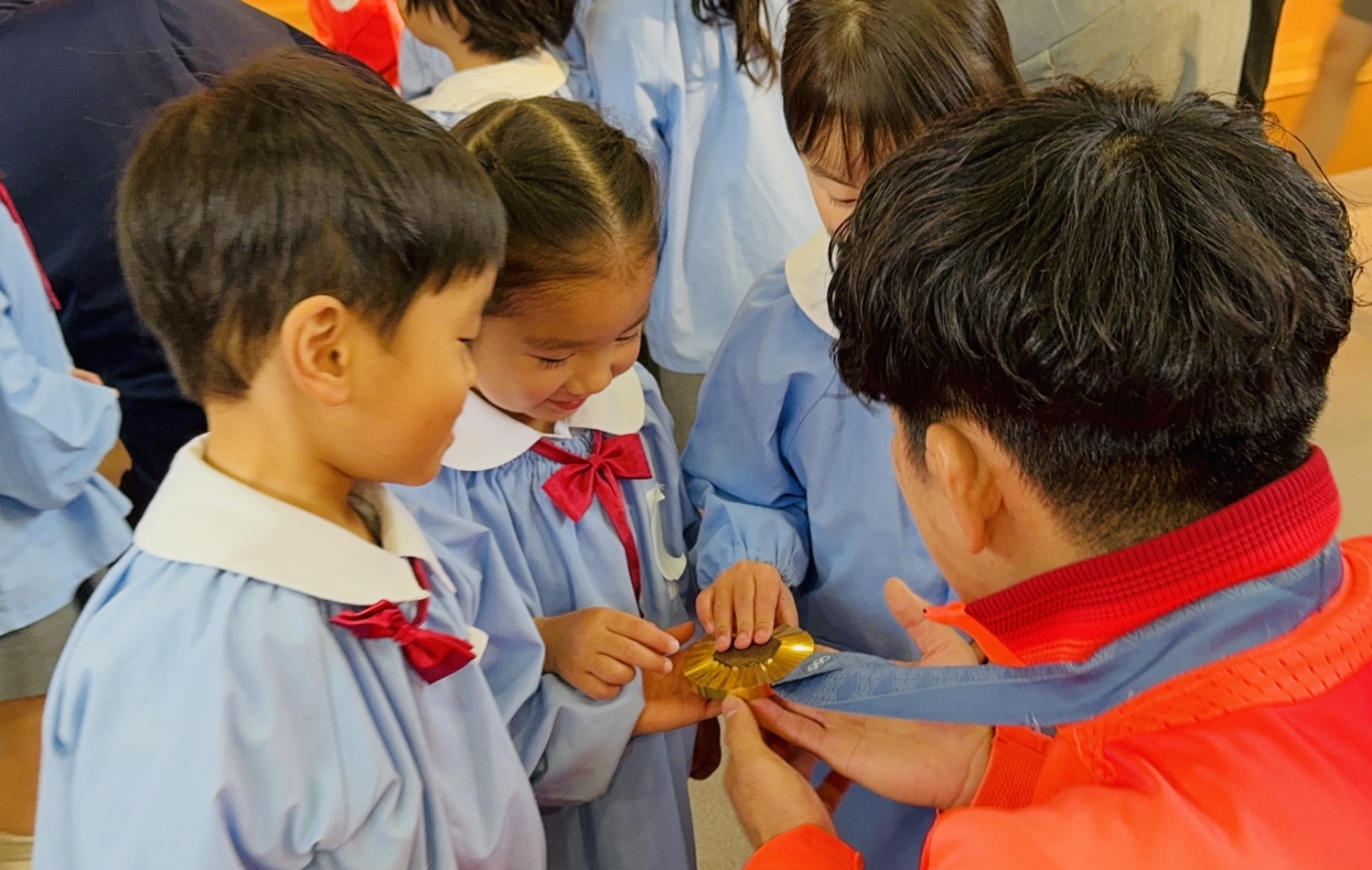 金メダルに触れて、本物を体感する園児たち