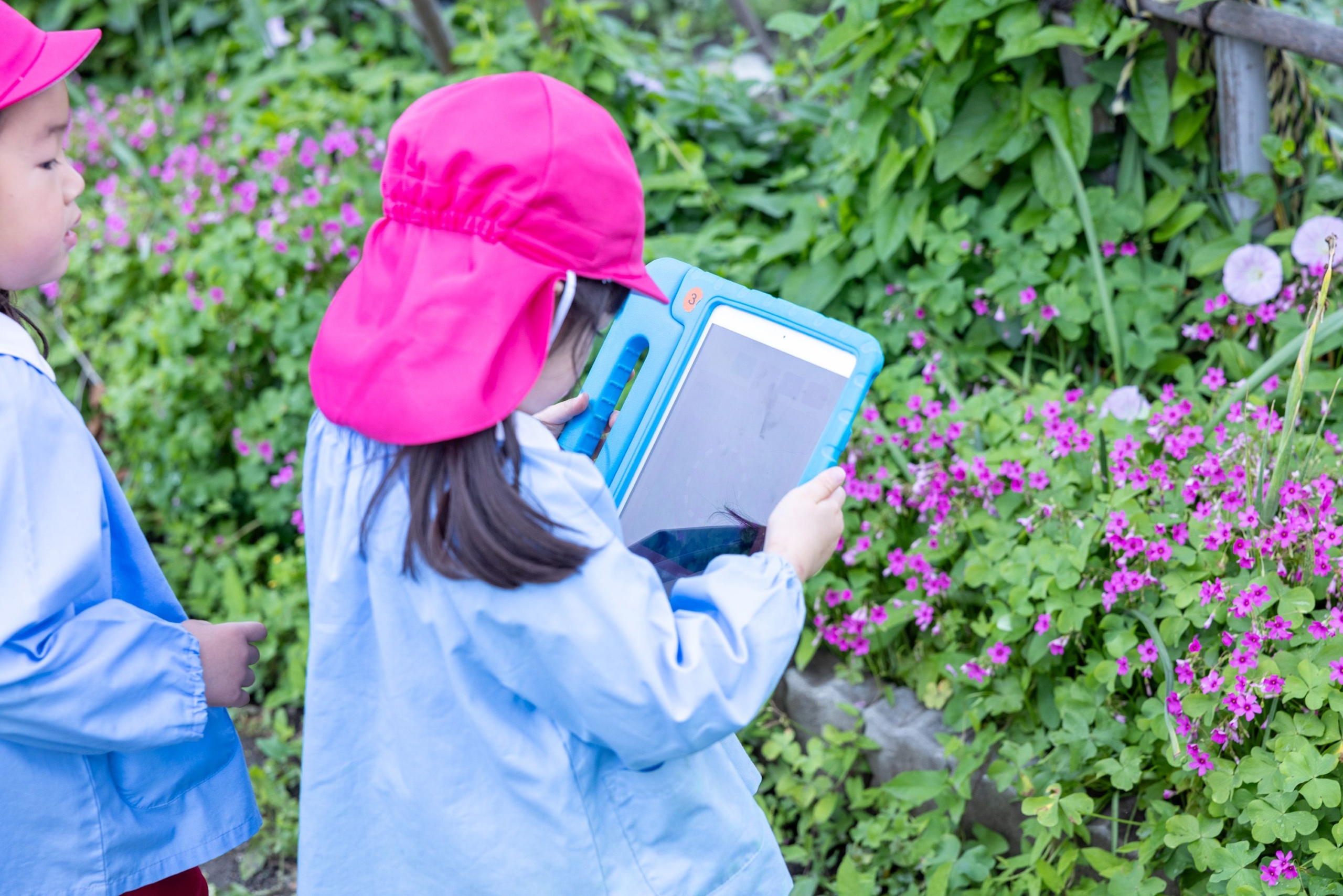 タブレットを使って、植物を観察する園児