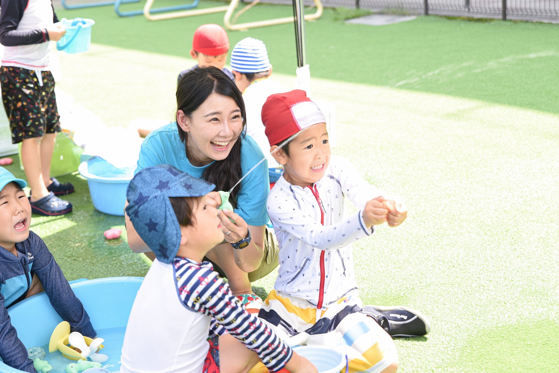 園児と水遊びをする先生