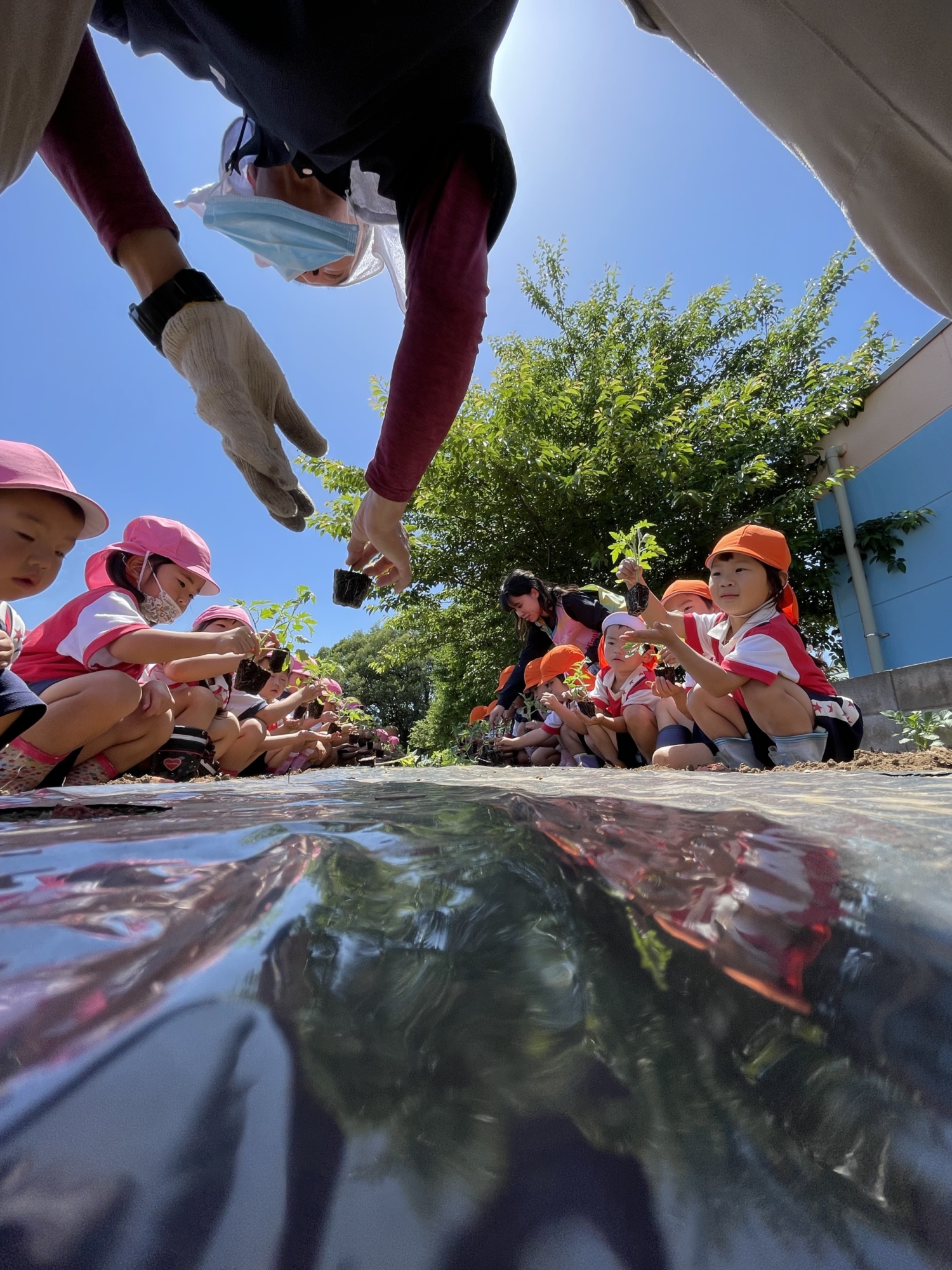 苗を植える園児たち